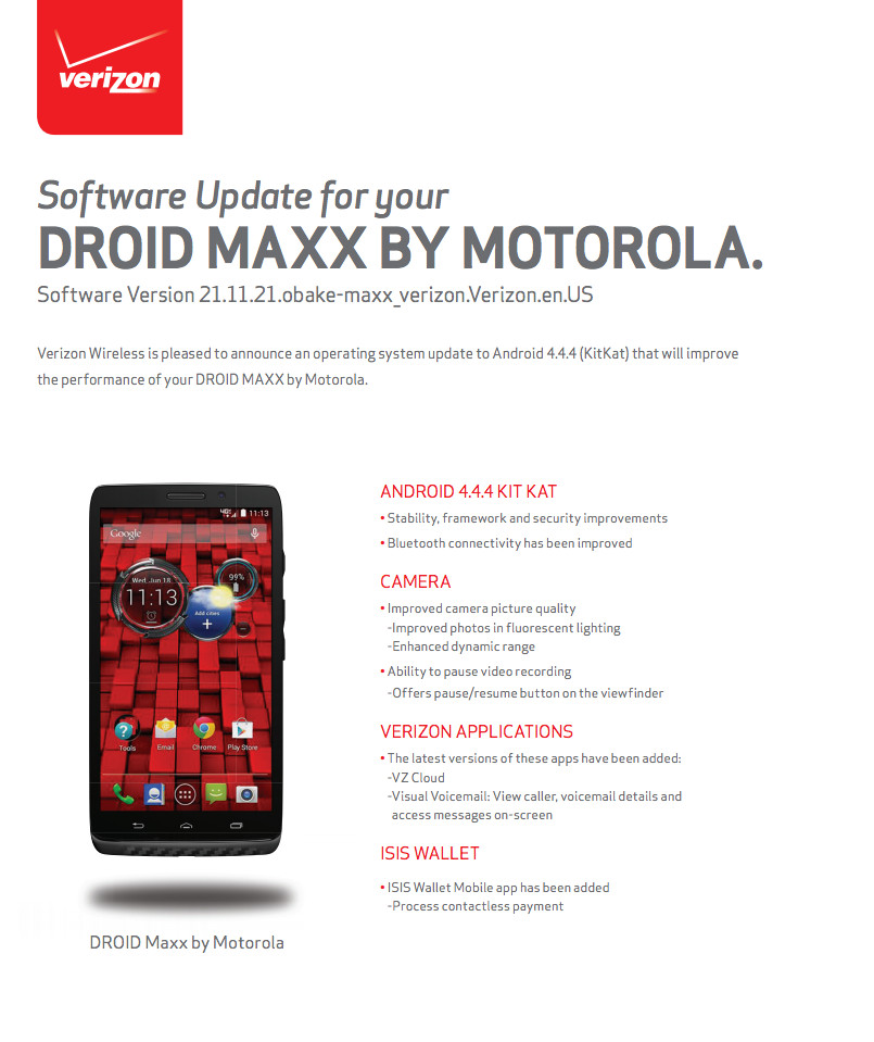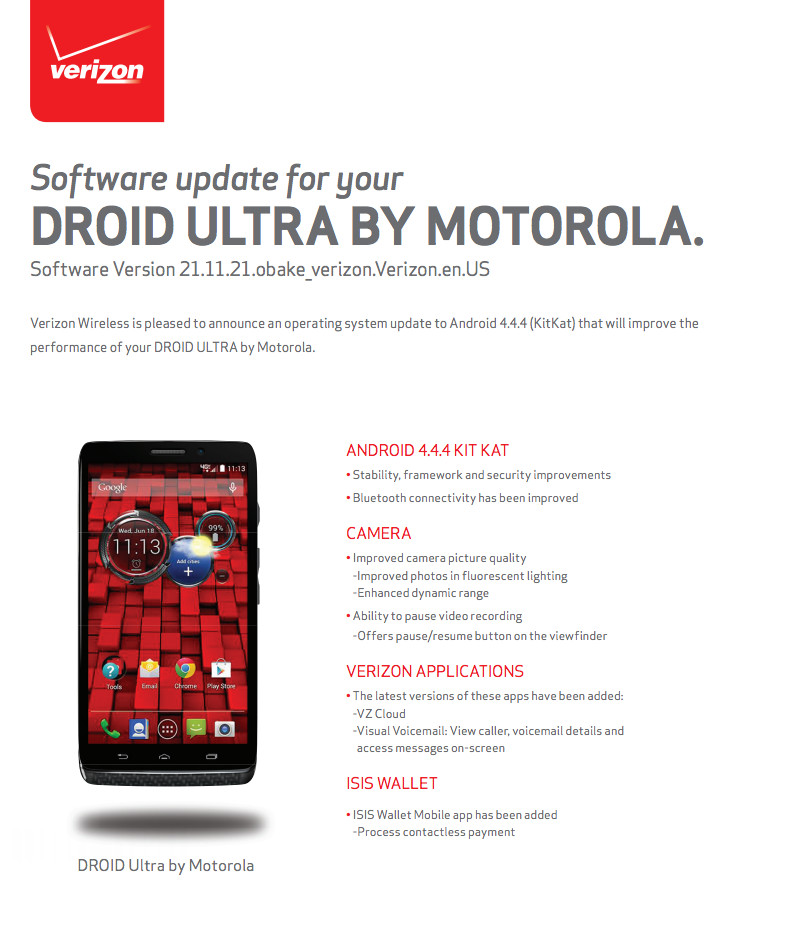 The DROID MAXX, ULTRA, and Mini all started receiving an update to Android 4.4.4 over the weekend that first began last Wednesday with a soak test. The minor changelog that showed up with the update prompt mentioned that there would be camera enhancements, the addition of Isis Mobile Wallet, and bloatware updates. Motorola released a full list of the changes today, along with Verizon’s standard PDF changelogs.