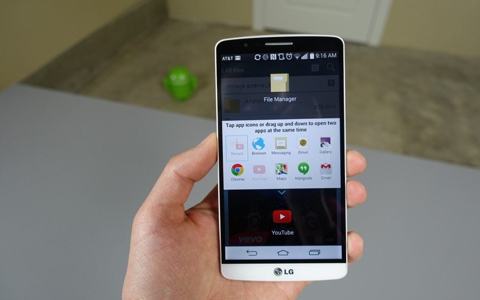 As far as the app list goes, you only have access in Dual Window to the stock browser, Chrome, Messaging, Email, Gallery, YouTube, Maps, Hangouts, Gmail, File Manager, and AT&T’s Locker. There are options for transposing the windows being used, to maximize one, to close them individually, or to manually resize each. There is a recent button that allows you to quickly pop up your last combo of apps, along with two shortcuts to quickly launch Dual Window (long-press Back, or open the app switcher and then tap the “Dual Window” button).