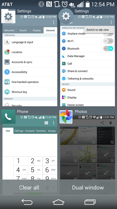 - Dual Window – Like Samsung’s Multi Window, LG also has a feature that allows you to launch two apps at once in windows situated above and below each other. The app list is limited, but you can do things like load Chrome and YouTube at the same time, get directions in Google Maps while having a conversation in Hangouts, or pull up photos from the gallery while polishing off an email in Gmail. It’s a decent effort, but probably not quite as fully featured as what Samsung is doing.