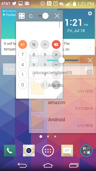 - QSlide – LG wants you to be able to multi-task in a number of ways. One of those options is through QSlide, which is a group of LG apps that can be launched into floating windows that hover above your current task. For example, you could be in Chrome on droid-life.com, but realize you need a calculator. QSlide allows you to open the built-in calculator in a floating window on top of Chrome. To take it to another level, LG lets you open more than one of these windows at a time and even adjust their transparency. The apps here are limited, but the phone, messaging, calendar, calculator, file manager, and stock email apps are all included.