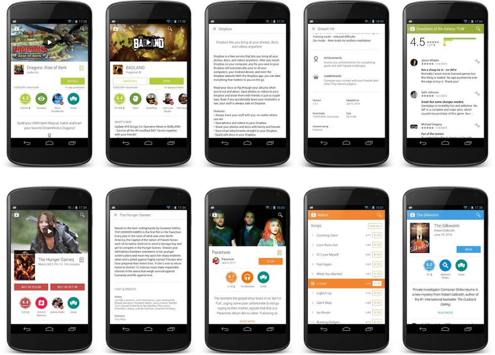 A new version of Google Play began to rollout this afternoon as build 4.9.13. The update doesn’t initially look like that big of a deal upon first launch, but once you jump into an individual app, book, album, or movie listing, you will immediately know that this is pretty major. The individual listings all appear to be designed with Material Design in mind. There are beautiful sliding animations, big imagery, and an overall cleaner layout.