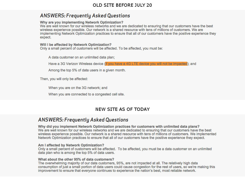 The changes on Verizon’s site to reflect this move are already taking place. Take a look at the screenshots below of Verizon’s Network Optimization page today compared to what it looked like back on July 20. There used to be references all over it to Network Optimization only affecting those with 3G connections, and that if you wanted to avoid being throttled you should buy an LTE device. But now, those references have all been removed. The new page is setup perfectly to cover all unlimited data users, including those with 4G LTE connections.