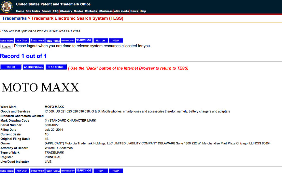 A reader of ours pointed out this morning that Motorola recently filed for a trademark of the name “Moto Maxx,” a name that could be used in a new smartphone. For those new to the name “Maxx” and Motorola, just know that the tag when attached to a phone usually means massive battery life. Does this mean the Moto line, which currently includes the Moto X, Moto G, and Moto E will also get a battery-beast brother?