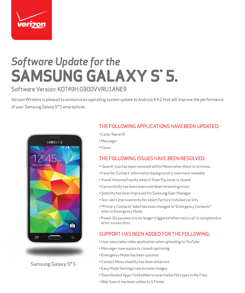 Verizon approved an update today for their variant of the Galaxy S5 as build G900VVRU1ANE9, but leaves the phone at Android 4.4.2. The update looks like a massive bug fixer, as it includes improvements to performance, brings updates to bloatware, and addresses all sorts of issues.