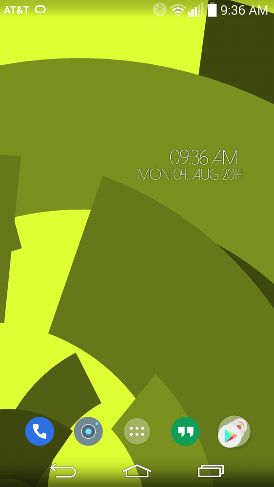I am running Nova Launcher with the FlatDroid icon pack. The wallpaper is from the Behang wallpaper pack, and the clock widget is called Timely.