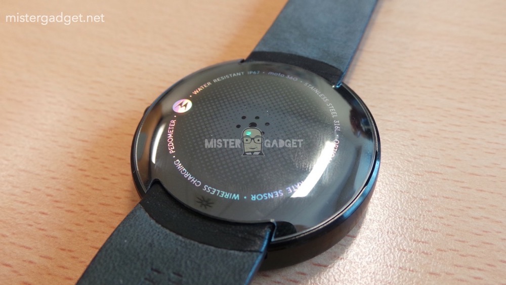 As is seen on the Moto 360 below (without those stickers), the device is water resistant at an IP67 rating, does indeed come in stainless steel (316L), has an optical heart rate sensor, pedometer, and of course, wireless charging. All of that info, was hidden by Motorola under a couple of stickers used at I/O.