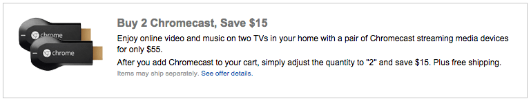Still have yet to purchase a Chromecast, Google’s incredibly useful $35 HDMI dongle? What if you could save $15 by buying two at once? Well, you can, thanks to a deal running through Best Buy. And trust me, you may as well own two since you will want these connected to as many of your home’s TVs as possible.