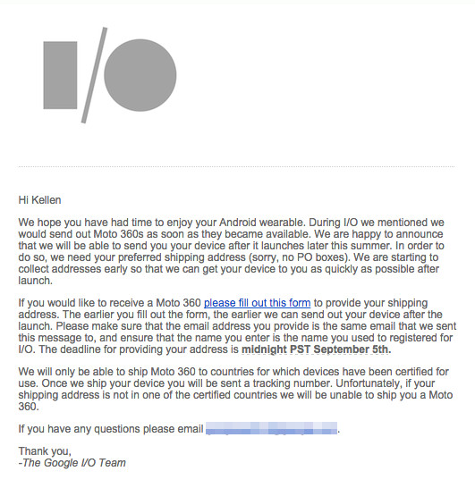 In the email, Google reminds attendees that they promised them a Moto 360 and that they planned to ship them “as soon as they became available.” No mention of a specific ship date was given, but they are giving attendees a deadline of “midnight PST September 5” to register their addresses. That happens to be the day after Motorola will give us the details for the 360.