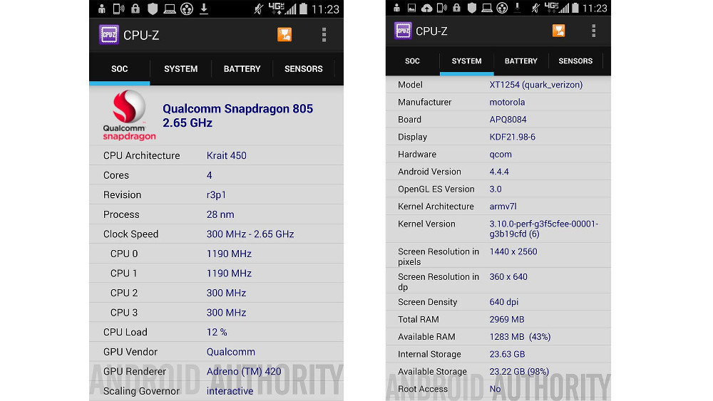 The CPU-Z screens with the name “quark_verizon” first surfaced through Android Authority, along with a couple of extra details. The benchmarks show a device running a Qualcomm Snapdragon 805 clocked at 2.65GHz, Adreno 420 GPU, 3GB RAM, 24GB of available storage (likely 32GB total), Android 4.4.4, and a display with a resolution of 2560×1440 (640×360 dpi, edit: display size is unknown). They also tossed out the potential name of “DROID Turbo” and the device having a 20MP rear camera, thanks to “anonymous” sources.