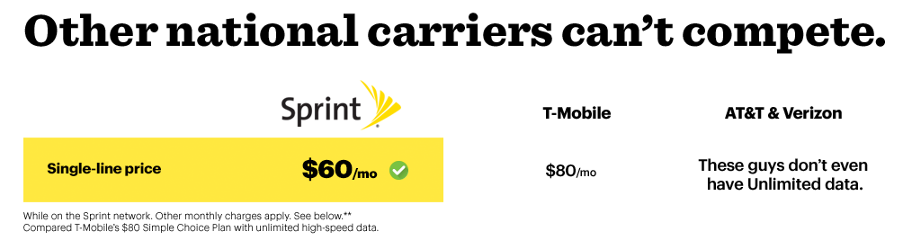For comparison sake, Sprint is pointing out that T-Mobile’s unlimited data plan runs $80, $20 more than this new unlimited option. They also make it clear to everyone that AT&T and Verizon do not offer unlimited data plans.