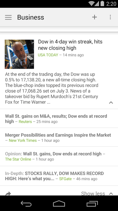 Once installed (or updated), you will find a minimal app that resembles both Google Now and Google’s desktop news site. There is plenty of white and grey, but you get the card-like, sectioned experience to see separation between weather and various news topics. You can expand items like the weather box to see more info (for multiple cities), swipe between pages to get to new topics, and add personalization by signing in with your Google account (or multiple accounts).