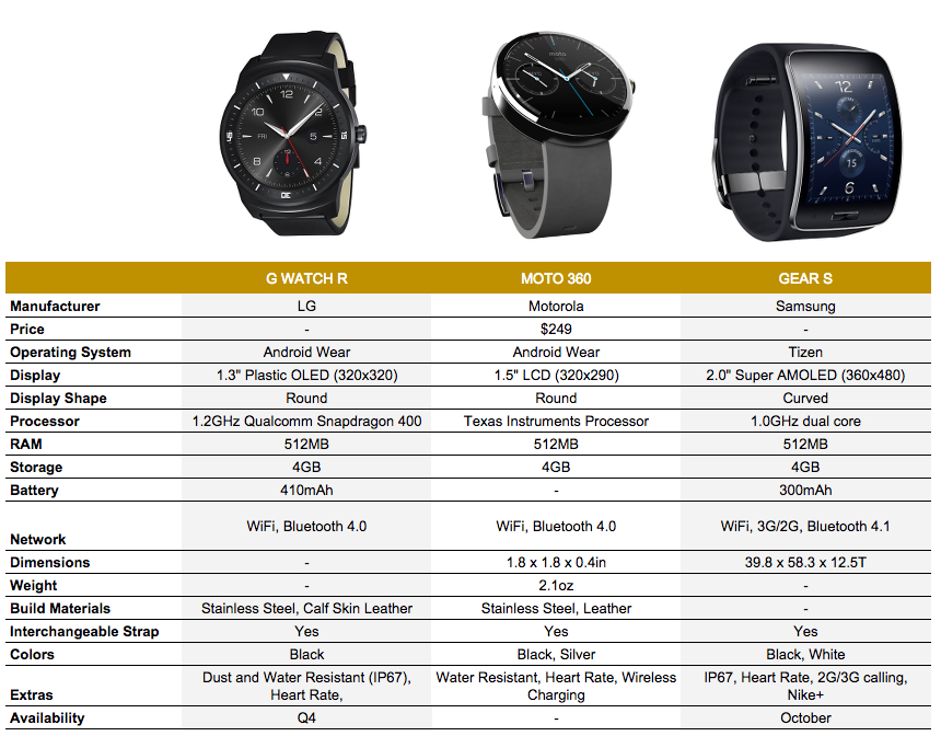 We have official info on both the G Watch R and Gear S, along with plenty of details on the Moto 360 through a premature Best Buy listing, just enough to for a quick comparison chart. Certain items are obviously missing, because each manufacturer has either withheld certain specifics from us or still hasn’t made it all official. Speaking of official, keep in mind that the Moto 360 information was again, taken from the Best Buy leak, so things could/may change.