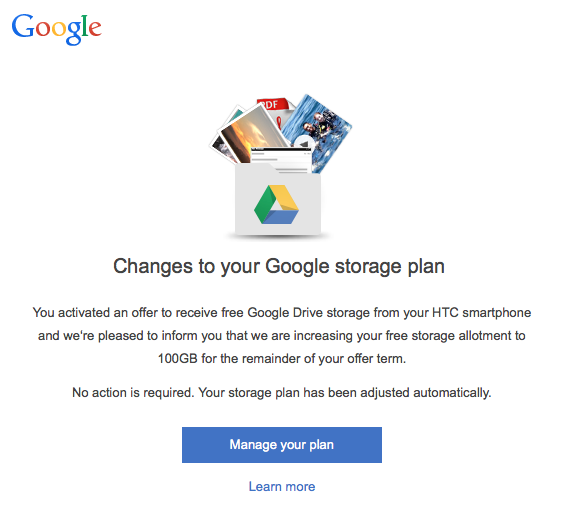 HTC is doubling the amount from 50GB for each device for the remainder of the offer’s promotional period. This Google Drive offer that came with select HTC devices needs to be redeemed by January 1, 2016, and is good for around two years. After that, the user can decide to purchase back additional storage. Understand that if a user decides not to buy more storage, that their files are still safe, they just may not be able to add any new files should they sit above a certain quota.