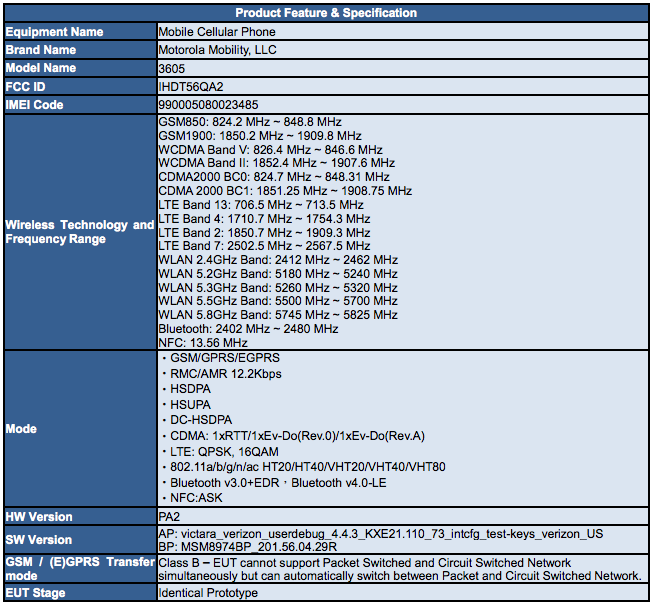 The listing doesn’t give us a ton of new info, although, we are still digging through it. So far, we are seeing support for Verizon’s CDMA2000, along with LTE 13 and 4. The device, like almost all Verizon phones these days, has global GSM roaming on bands 850 and 1900.