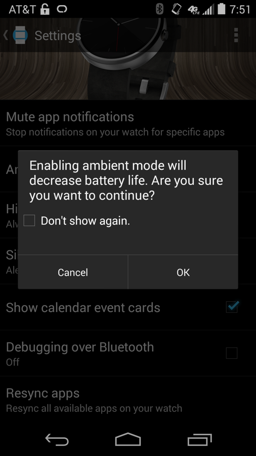 What is Ambient Screen Mode? Well, the setting does one thing when turned “on” – it leaves your Moto 360 display on in a dimly-lit, almost-always on mode when you aren’t using it. In other words, with Ambient Screen turned on, your watch face stays on to help your 360 look and act much more like a normal watch would. The idea here as that every time you glance at your watch, it should already be showing the watch face, so that you have to rely less on the sensors inside trying to figure out if your wrist movement should turn the display on or not. As you can imagine, this mode drains the battery significantly faster than with Ambient Screen mode turned to “off.”
