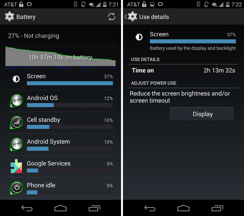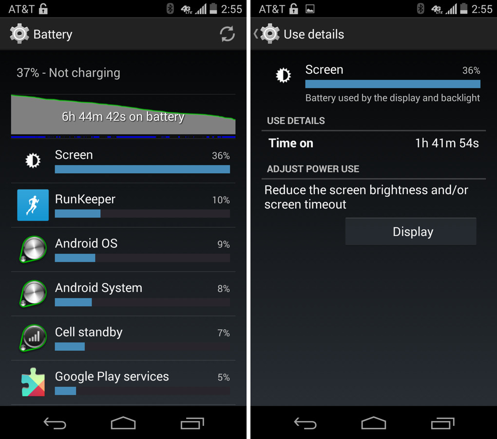 And here are the last two days that I remembered to screenshot battery life, both of which were frustrating days, to say the least. Each day, I had errands to take care of, runs to go on, or parties to attend around town, so because I was monitoring battery life, felt I was forced to charge my phone long before I normally would like to. In the image on the left, you can see where after 2+ hours of screen-on time, I grabbed a charger to make sure the phone would last through the night, yet it was only 4PM. In the image on the right, you are looking at close to 7 hours of use (which included a 6 mile run with GPS tracking, about 50 minutes of time) and around 37% battery left. Since I was headed out of town, I plugged the phone in during my drive to make sure I wasn’t left stranded without a working phone later on in the evening.