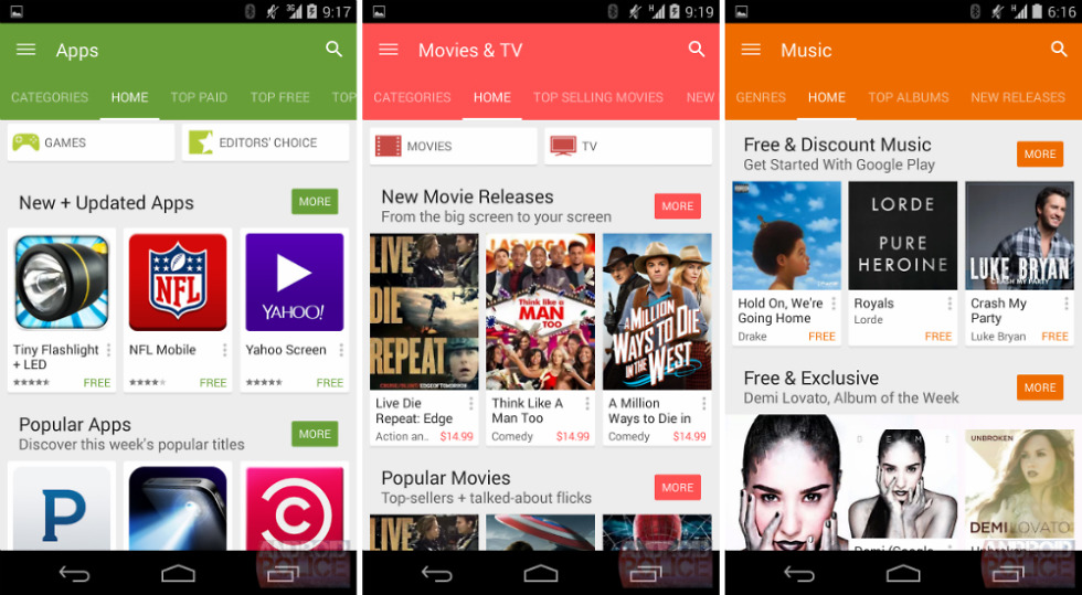 In terms of what looks new, the only real change is the huge amount of bright colors Google is throwing into the top of categories. As it is right now on most Android devices running Google Play, the top bar is colored in, but each separated category is set to a gray backdrop. With this update, even the categories are receiving the bright-color treatment.