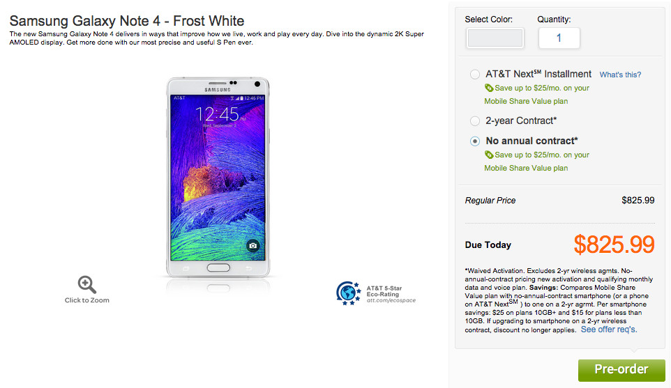 The on-contract price remains $299, like all previous Notes. If you choose a different payment route, things get a little wonky depending on which carrier you choose. Verizon will get you into the Galaxy Note 4 for $34.99 per month for 20 months if you choose their Edge payment plan, or $699 if you want to buy it up front. AT&T has two payment plans available of $34.42 per month or $41.30, with the difference in price happening because of upgrade times. If you want to buy the Note 4 at full retail from AT&T, they are currently listing it at $825.99. That, is insane.