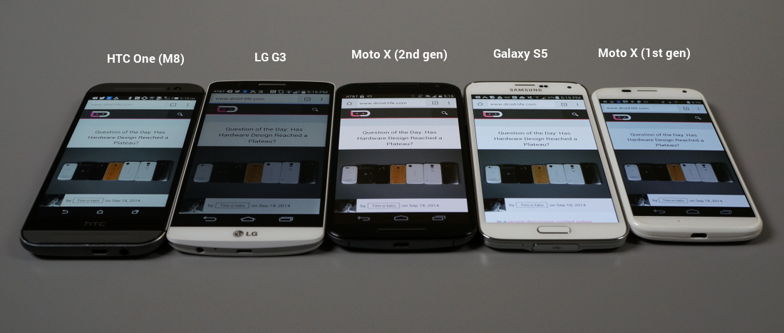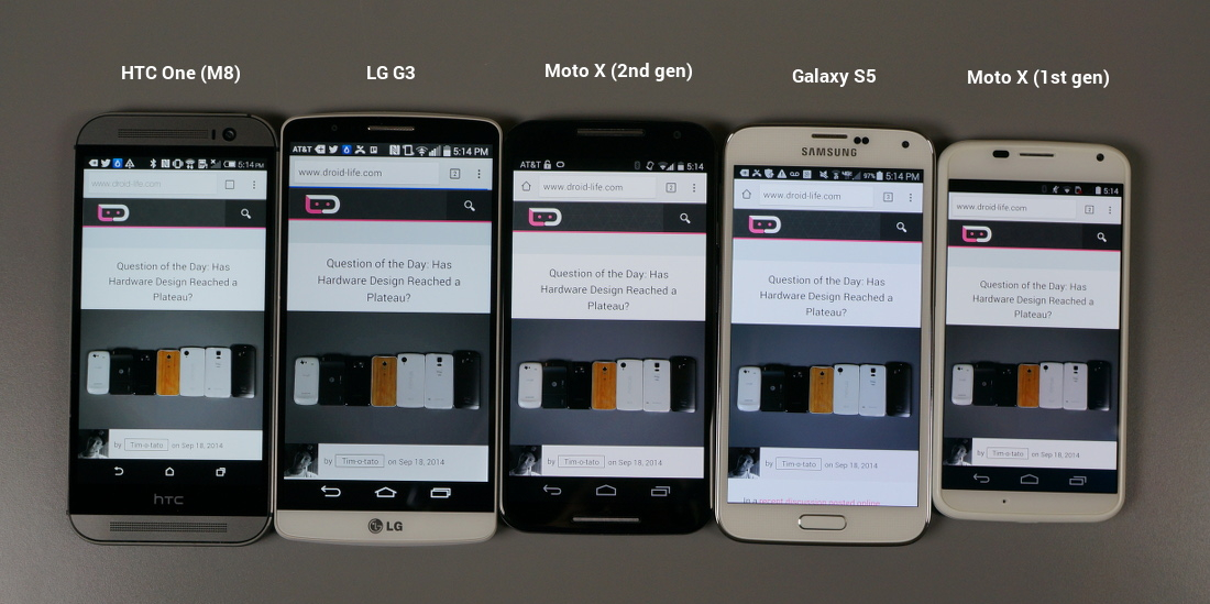 As you can see in our comparisons above, the new Moto X panel comes off quite warm when you compare it to the LCDs used in the LG G3 and HTC One (M8), along with the Super AMOLED used in the Galaxy S5. It’s actually about as warm as the original Moto X (that slightly orange-ish/yellow-ish tint), which if I’m being honest, bothered me after a while last year. So far, though, the AMOLED panel on the new Moto X is pretty great. I didn’t actually notice how warm it was until I took these pictures.