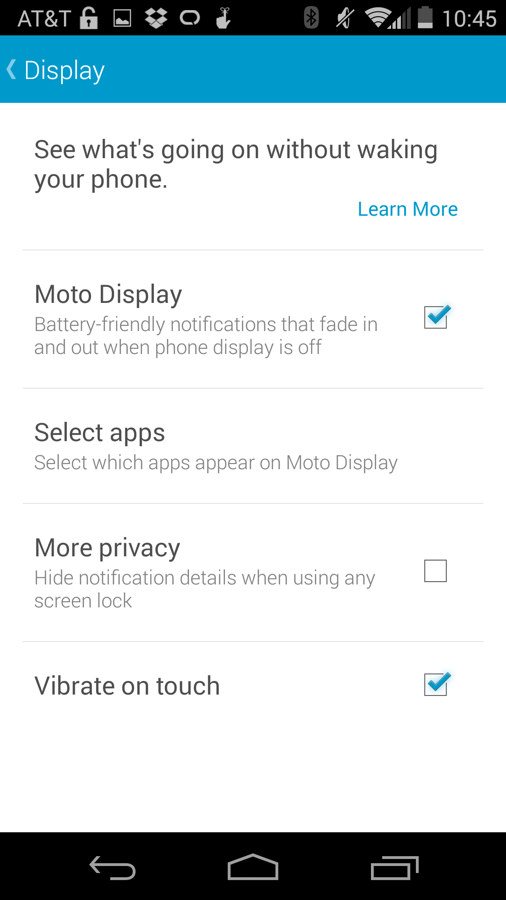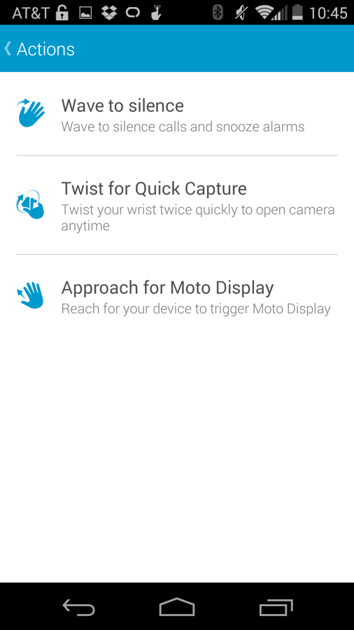 Moto Actions are the new option to the group and use the new infrared sensors housed in the front of the display. With Moto Actions you can wave over the top of your phone during an incoming call to silence it and also watch as Moto Display lights up when your hand approaches the device. Last year’s Quick Capture twisting motion is technically a part of Moto Actions as well.