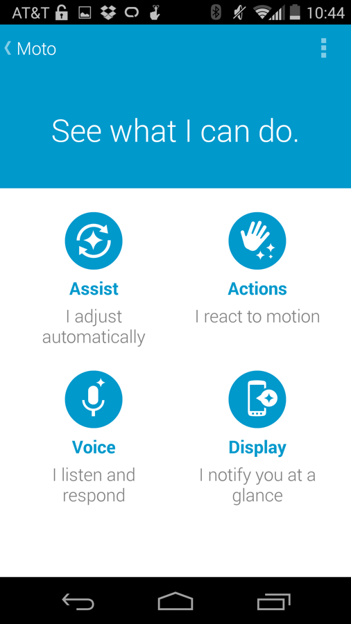 The Moto X’s best features are back again this year as a rebranded Moto app. Touchless Control is now Moto Voice, Active Display is now Moto Display, Assist is still Assist, and then we have a new player in the group called Moto Actions.
