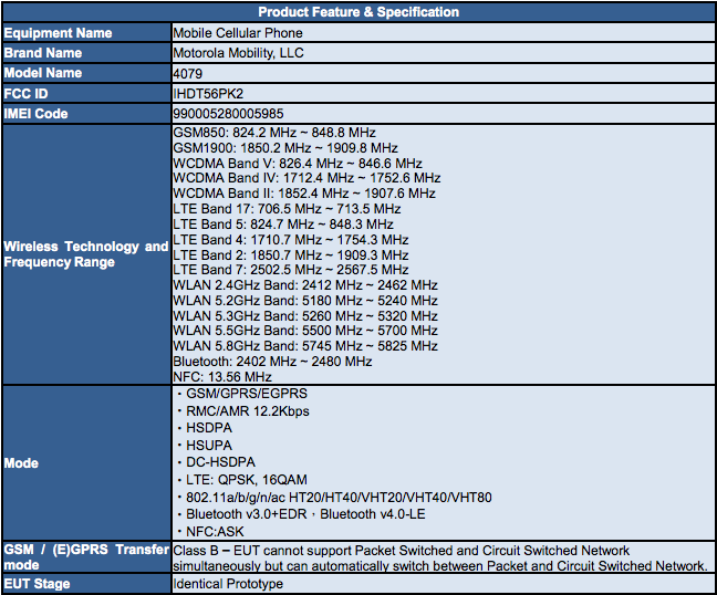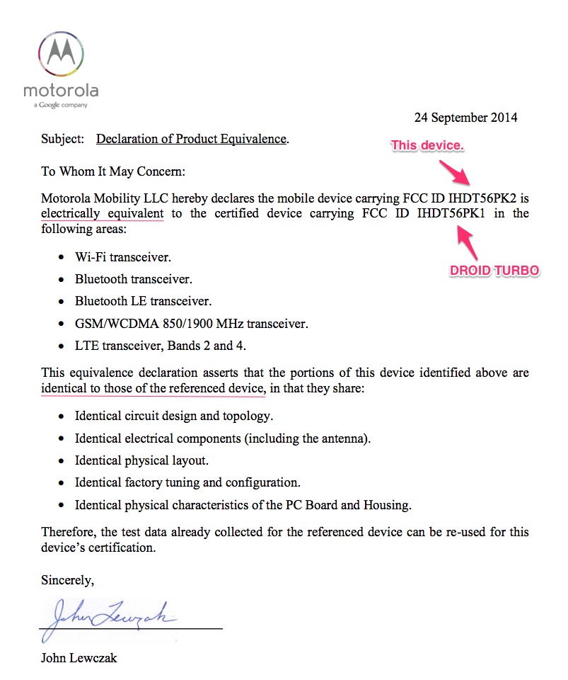 Update 2: As was pointed out in the comments and on Android Face, the documents actually say that this is basically the equivalent of the DROID TURBO. In fact, they specifically reference the DROID TURBO FCC filing, noting that this is both electrically and mostly physically equivalent, including in design and topology, electrical components, physical layout, factory tuning, and physical characteristics.
