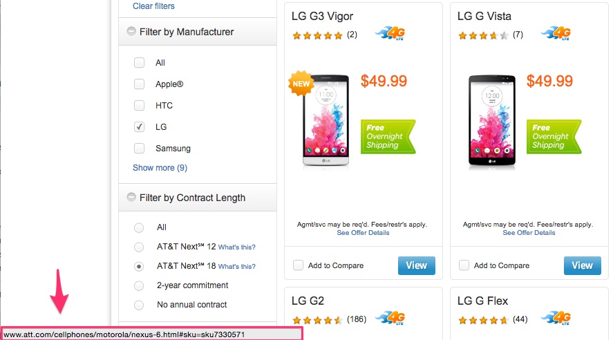 With that said, AT&T has essentially killed off the listing for the LG G Vista to prepare for the Nexus 6. If you cruise through the maze of screens to get to a listing of LG phones and click on the LG G Vista, you won’t find the LG G Vista. No sir, you will be redirected to a page that will eventually be for the Nexus 6, but that, for now, redirects to a listing of Motorola phones. Check the image below, which is the URL currently set for the G Vista, as seen as I hover over the listing of it. Yep, that says “/motorola/nexus-6.html” as clear as possible.