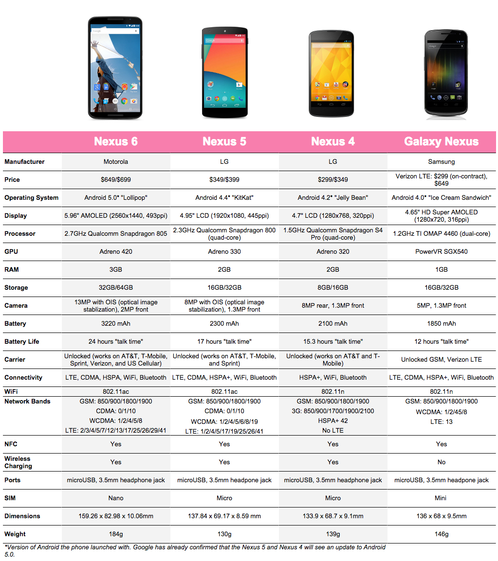 And that got us thinking – what does the Nexus 6 look like when stacked against the two previous Nexus phones, the Nexus 5 and Nexus 4? It, of course, tops them in almost every category, since it is the new kid on the block. But it is still interesting to see how far we have come. Remember when the Nexus 4 completely lacked all LTE connectivity. Well, the Nexus 6 supports a full 12 LTE bands.