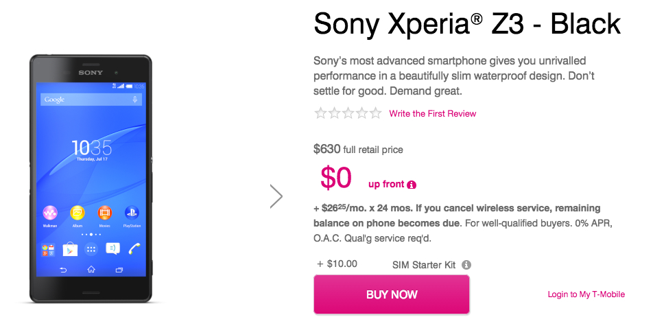 The Xperia Z3 on T-Mobile features a 5.2″ Full HD display, waterproof design, 20.7MP rear-facing camera, Snapdragon quad-core processor, 3GB of RAM, 32GB of storage, and runs Android 4.4+.