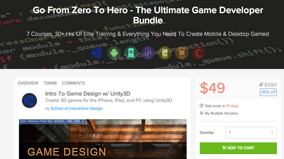 How would you like to make the next Flappy Bird or Granny Smith? What’s that, you have absolutely zero developing games? You need not worry, my friend. Through the DL Deals store, you can pick-up the Ultimate Game Developer Bundle for just $49, a 95% discount off the suggested price of $989. Seriously, that says 95% off. 95%.