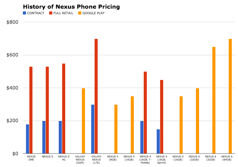 On the flip side of this equation, we have had a lot of conversation surrounding the pricing of the Nexus 6 as being higher than normal for a Nexus phone. Is it high, though? After looking back at the history of Nexus phone pricing, I would tend to argue that it is a bit higher than normal. Take a look at the chart below.