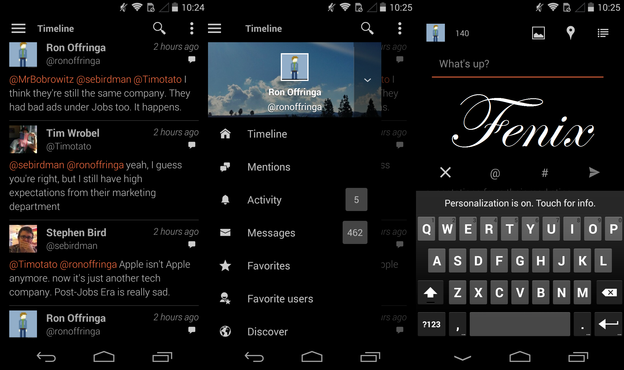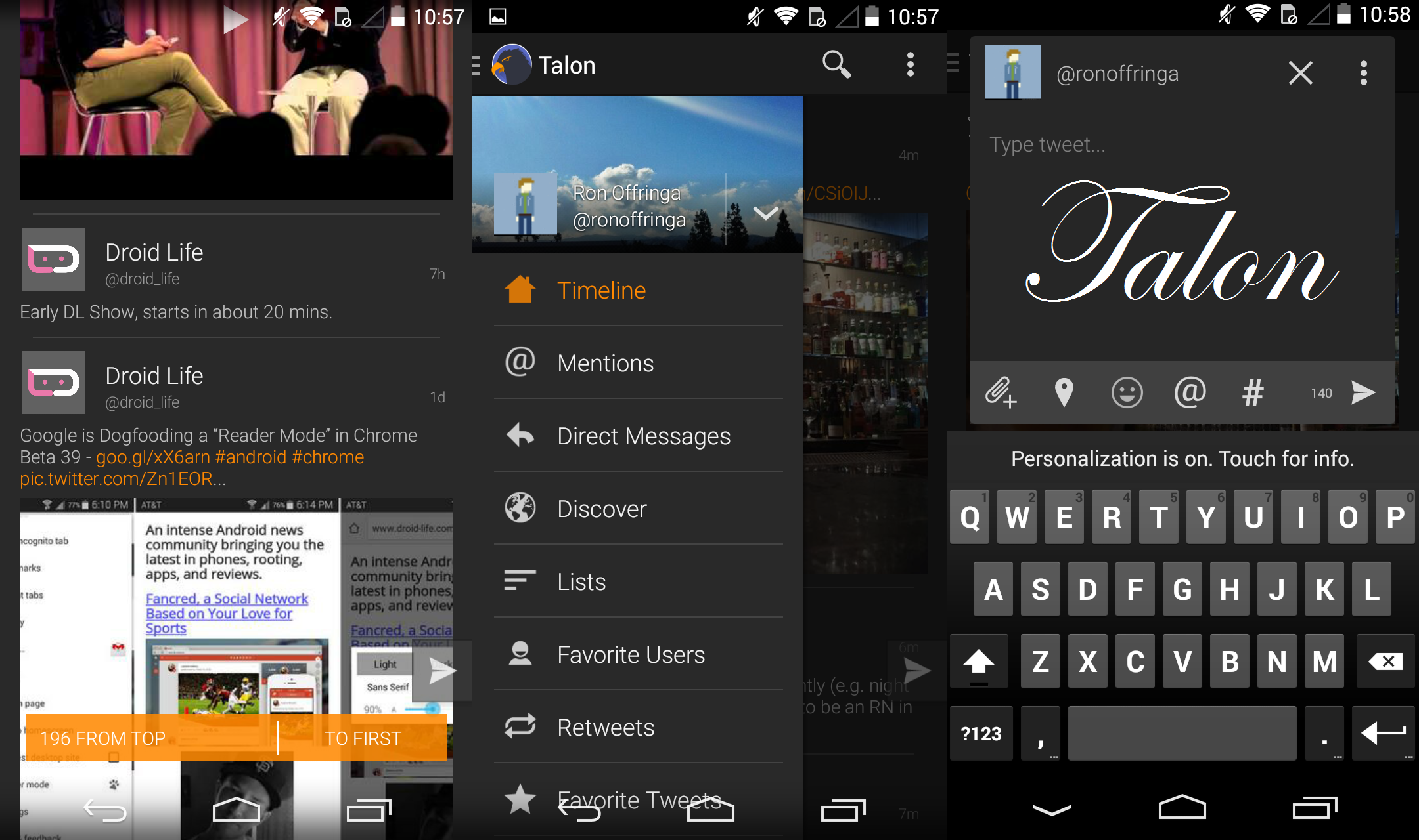 Talon and Fenix have been my favorite Twitter apps to use on Android. Both have extremely similar UIs and feature sets. I prefer reading Twitter in Talon because it has the option to jump to the top of your timeline towards the bottom of the screen whereas Fenix jumps to the top by tapping the top of a column, which is far less usable on 4.x” devices. For composition, however, Fenix has the edge between a swipe gesture to compose and faster access to quoting tweets with a comment. Talon also supports themes, which means you can customize the look of the app (although I ended up sticking with a stock view).