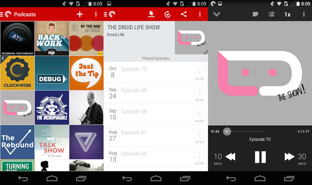 While there isn’t an app with all of those features on Android, Pocket Casts comes close with a beautiful design and plenty of controls to ensure you’re able to listen to podcasts the way you want to. Pocket Casts also has an iOS app, so if you’re one of the many Android phone/iPad people out there, you can keep up with your shows on both devices. Pocket Casts supports Chromecast on the Android app and AirPlay on the iOS app so you can shoot your shows to a TV if you’re so inclined. My favorite thing about Pocket Casts, though, is definitely the clean, album-art-centered design. It reminds me of a wall of LPs that I always wanted.