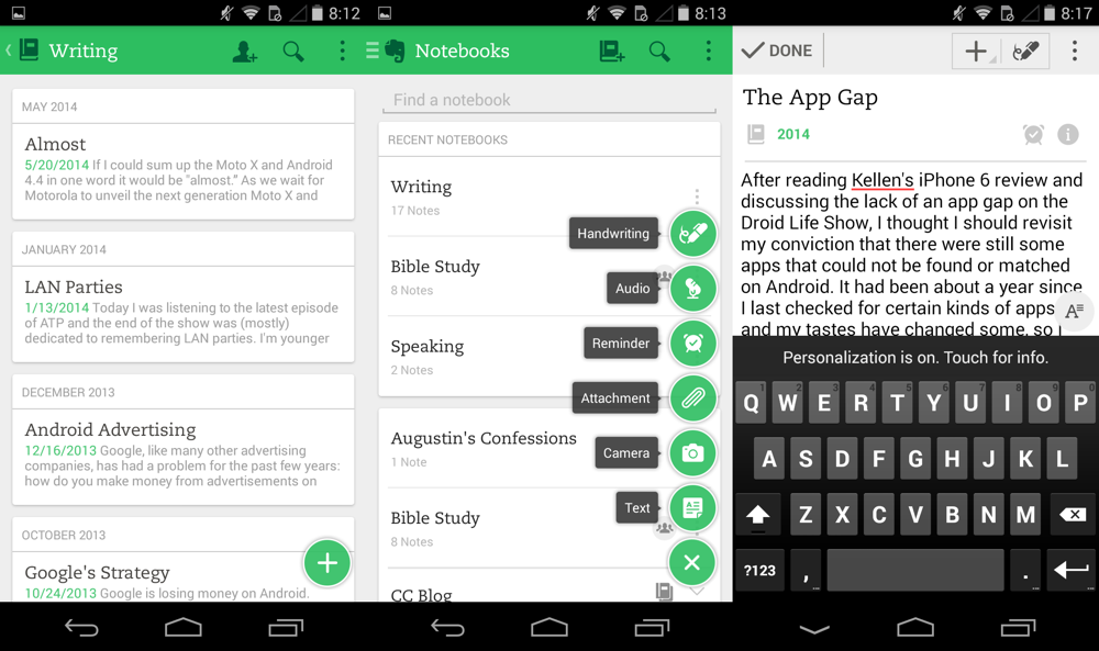 Android has seen an increase in note taking apps as well. This was one category that seemed to be ignored by developers even a year ago. That being said, the only app I would consider recommending is Evernote. Not only does Evernote have pretty much every feature that someone could want in a note taking app, but it has a beautiful design. There are cleaner, simpler note taking apps out there, but Evernote takes the cake for features and design in my opinion.