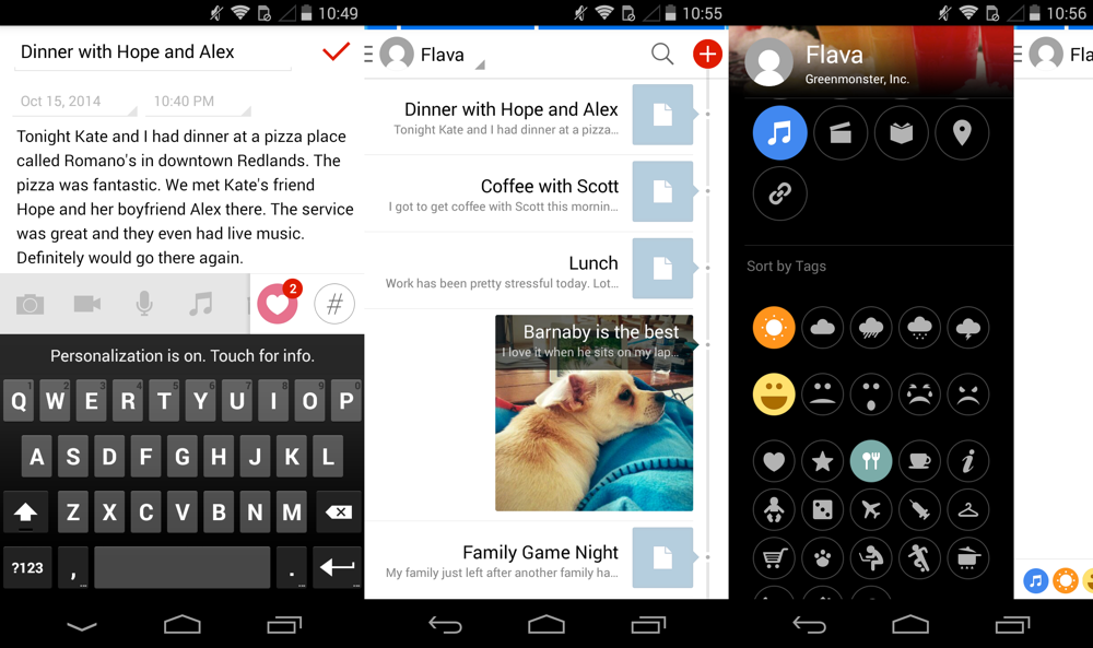If you’re looking for a full featured journaling app on Android (and iOS and Chrome) that isn’t from a developer with blatantly compromised morals, consider Flava by Greenmonster. Flava identifies itself as a journaling/note taking app, but it feels more like a social network for yourself (Path specifically). Entries can be something as simple as text, a picture, a location, what you’re listening to, how you’re feeling, or all of the above. It has a modern, clean design and it’s free to try. If you hit the 250 MB cap, want to add multiple photos, or x then you’ll need to pay through an in app purchase.