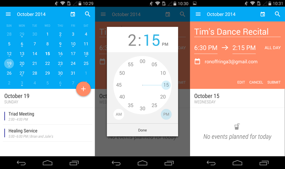 Today Calendar doesn’t have integration with a reminder app or text parsing, but it does have a month view with details below and a gorgeous Material design. The app has beautiful animations, a translucent widget, and color options. With a text parser it would be perfect, but for my usage it’s functional and beautiful.