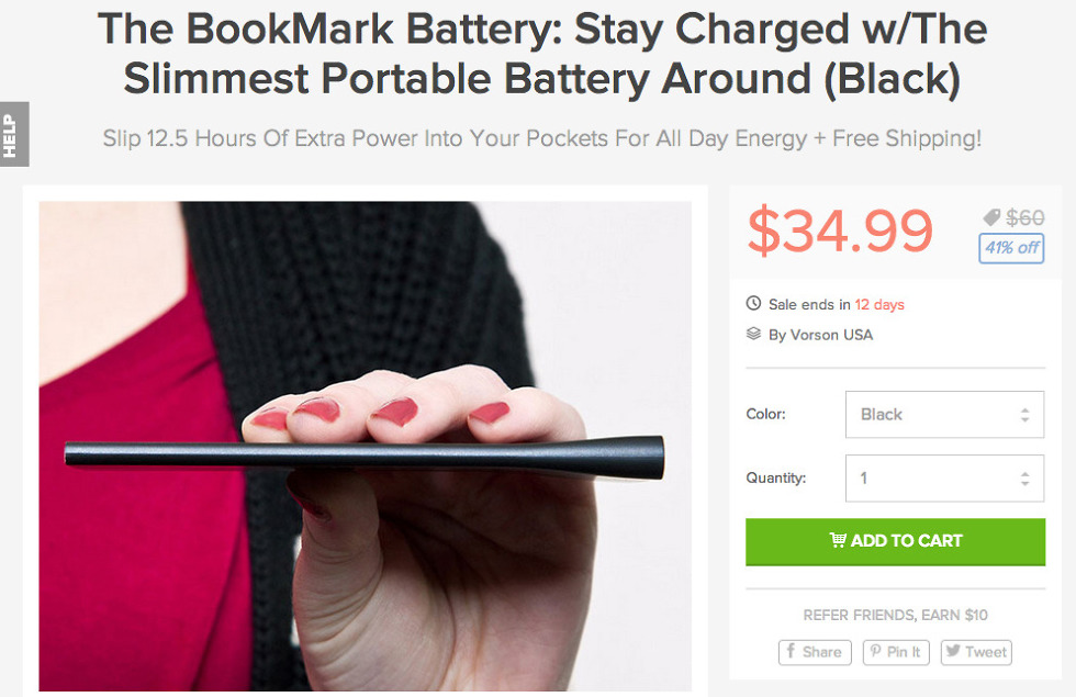 The BookMark Battery is the latest to go on sale in our Deals store. It’s an incredibly thin (4.7mm) 2,500mAh battery pack that will give most phones an entire charge before it needs replenishing. It has a touch indicator to show how much power it has left, comes in either black or white, and was designed to fit perfectly into a pocket, even a pant pocket. It inputs at 5v-1000mA, outputs at 5v-500mA, and has a cycle life of 500 charges.
