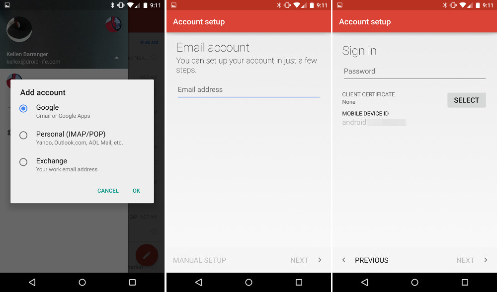 As far as the third party email and Exchange support, it is certainly built in. When you swipe out the left-side hamburger menu, you will see an option to “Add account” that will pop-up a window with three choices: Google, Personal (Outlook, Yahoo, AOL, etc.), or Exchange. Depending on which you choose, the app will walk you through a series of simple steps to get you up and going. Once setup is complete, your Exchange or third party email accounts will be in the slideout menu’s drop-down as available accounts to use when in Gmail.