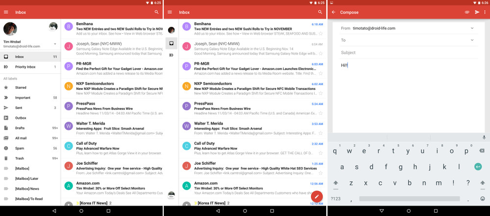 The first thing you will notice is the big, beautiful red action bar at the top of the app that blends into the status bar. We have a pulled out hamburger menu icon, a move that seems to be born from Material Design. Tap that icon or swipe from the left and you expose the slideout menu that houses your accounts (including Outlook, Yahoo, etc.) and email categories/tags. You have a persistent search button up top to help you take advantage of Google’s best-in-class email search. Also, to start a new email, all you need to do is tap on the floating red button in the bottom right corner.