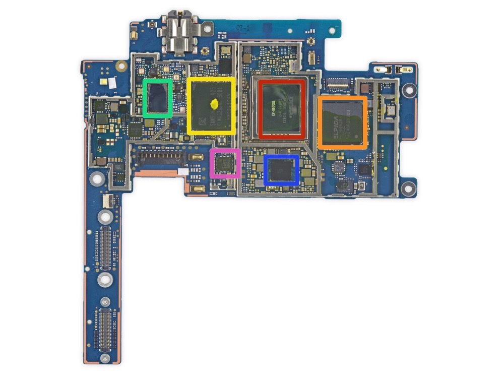 One of the more interesting parts of a teardown is to look at the board which contains the device’s brains. On the Nexus 9, the main workhorse is the 64-bit Tegra K1 processor, followed up by Epida/Micron Technology storage, Samsung Flash memory, Broadcom WiFi module, and a Texas Instruments chip labeled TI47CFP91 T65913B3D9.