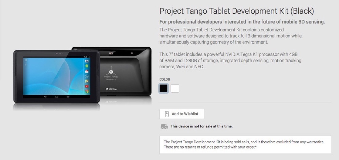 Google’s Project Tango, the NVIDIA Tegra K1 powered tablet that is used to track and map 3D environments to “give mobile devices a human-scale understanding of space and motion,” showed up on Google Play last night. Unfortunately (or maybe fortunately), you can’t buy it just yet. However, there are listings for both black and white models, so we get the feeling that someone will be able to buy it soon.