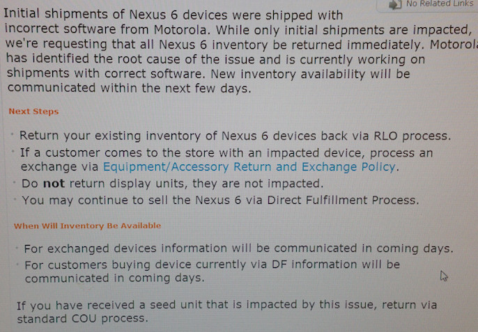AT&T stores are being told to send back initial shipments of the Nexus 6 due to a software bug that Motorola has identified, according to multiple sources.