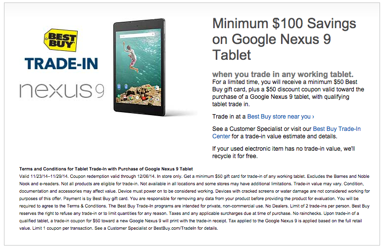 From now until November 29, if you trade in any working tablet at Best Buy, you can get a minimum savings of $100 towards the Nexus 9. If your tablet is in working order, with no cracks on the display, you will receive a $50 gift card, as well as a $50 discount coupon towards Google’s tablet.