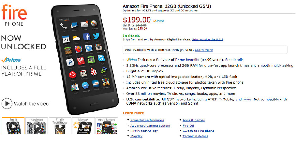 I don’t really know what to say with this one other than, yep, the failure that is/was the Amazon Fire Phone is finally priced where it should have been out of the gate. For $199, and without a contract or AT&T involvement, you can buy Amazon’s first, ultra-gimmicky phone.