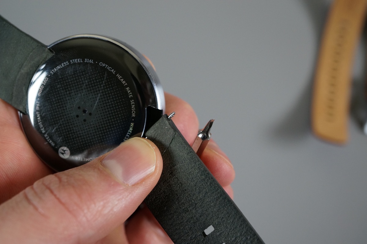 7. With pins in the new watch band, it’s time to attach them to your 360. Take one end of the watch band (with pin) and insert the pin into one side of the slot on the 360 (should be able to find a little hole on each side). With it held firmly in place, you need to compress the other side to get it to slide back into the watch. You can use a fingernail if you want, but I had better luck using the flathead screwdriver we used earlier.