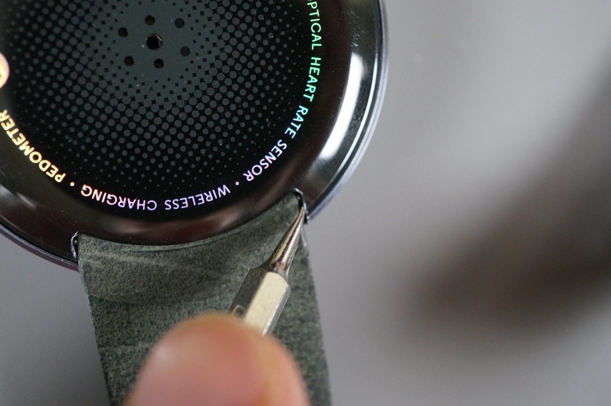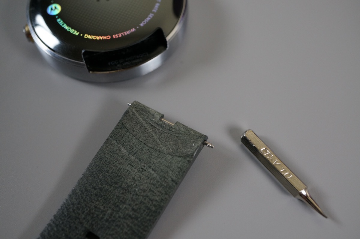 1. Watch bands are held in place on watches through a spring-loaded pin connector. In order to swap out a watch band, we need to disconnect that pin before we can remove the watch band. Using the flathead bit and a little pressure, you can do this pretty easily.