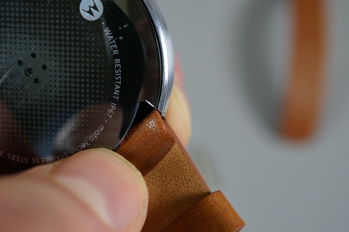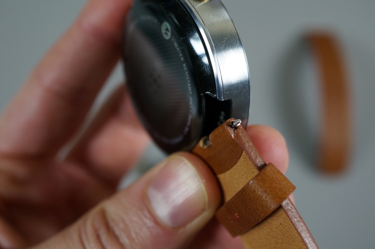 2. With Moto 360 and flathead screwdriver in hand, you are going to slide the screwdriver in between the leather band and where it connects to the Moto 360. The goal here is to use the flathead bit to slide the watch band’s pin out from the body so that it releases. You may need to squish your watch band to the right or left side of the 360, so that you are exposing the pin connector.