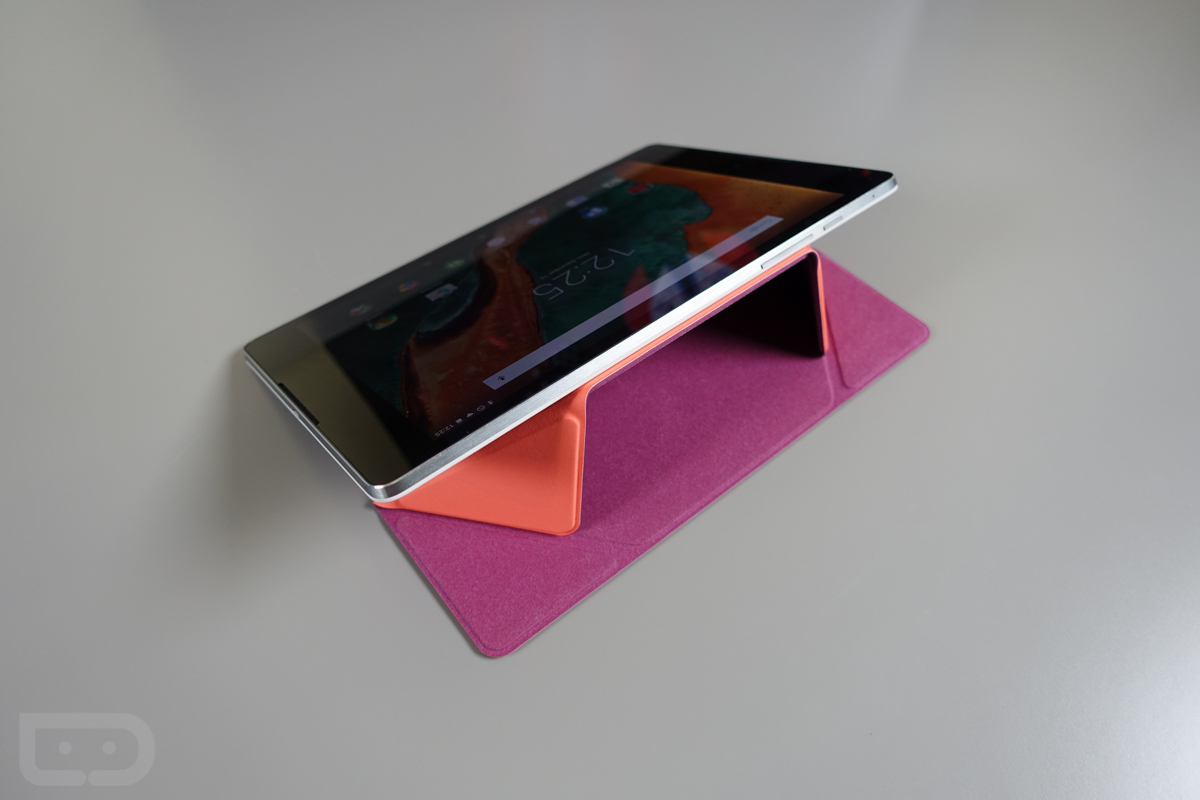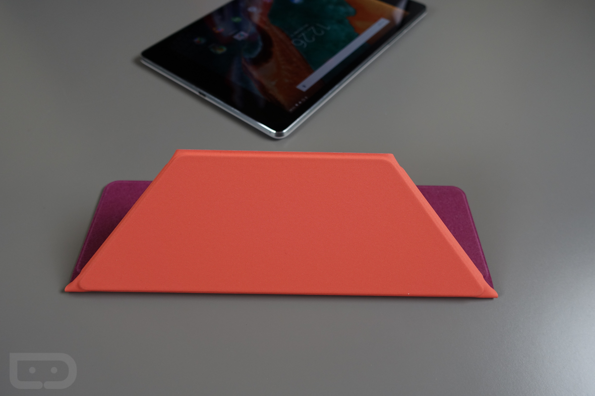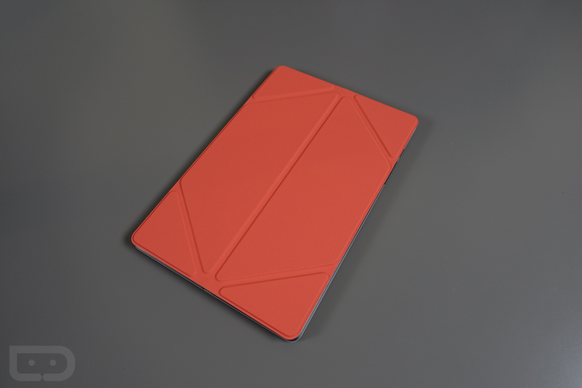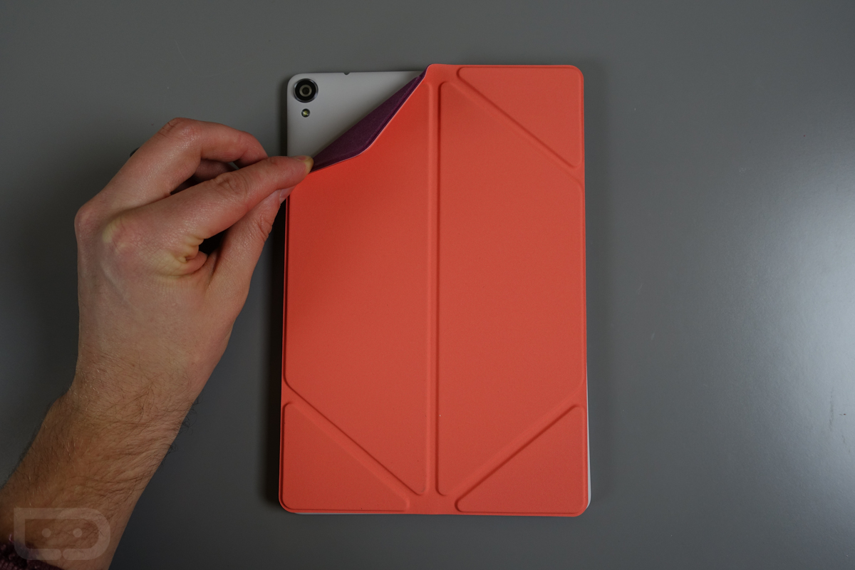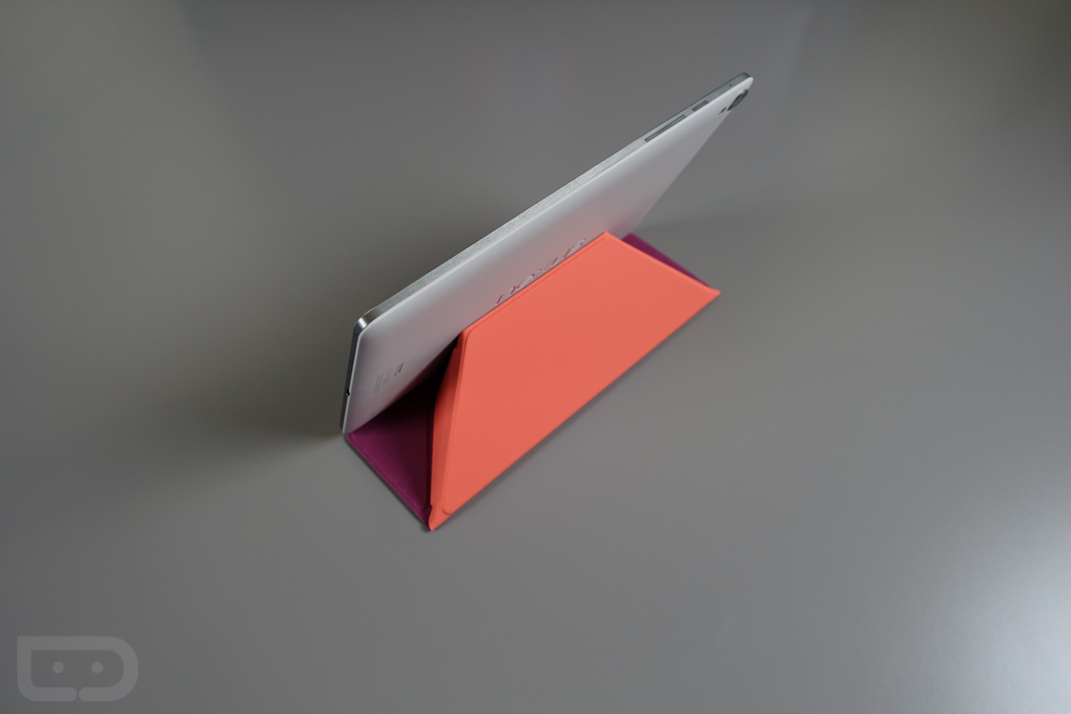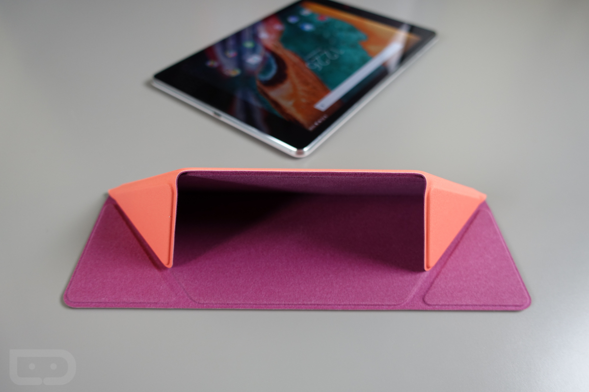 But now that it’s in house, I certainly have some thoughts to share. First, the design is quite nice. I have the coral amethyst version here (other colors on the way), which features both felt and rubberized sides. So you have a soft felt side that protects your display, along with another grippy side to help you maintain a firm hold on the tablet when transporting. It also has origami style folds throughout so that you can prop a tablet up on it in a couple of angles. It even has this neat trick on the backside that launches the camera automatically if you were to flip down a corner, uncovering the corner.