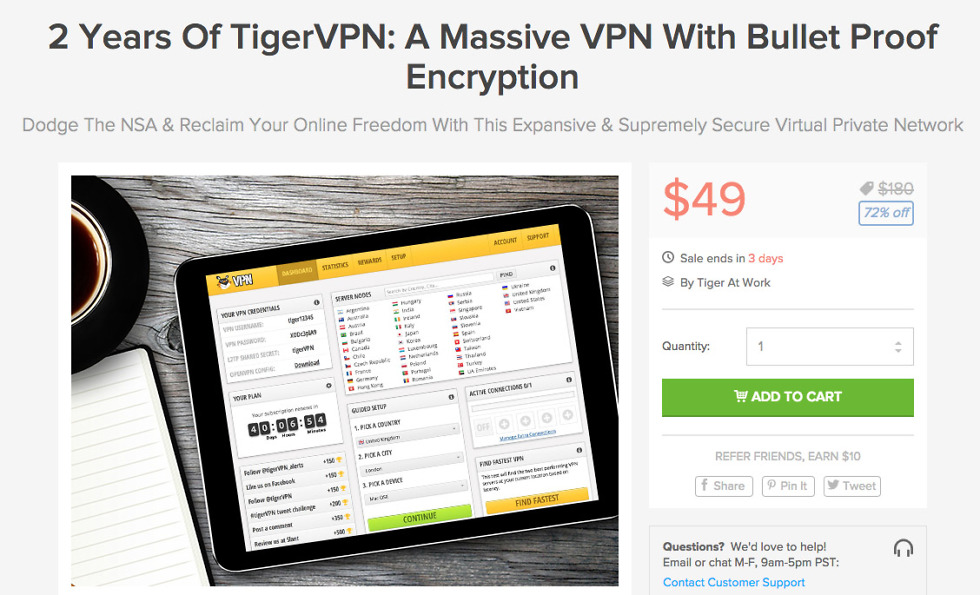 - Karma rewards: Extend your subscription by telling friends about TigerVPN