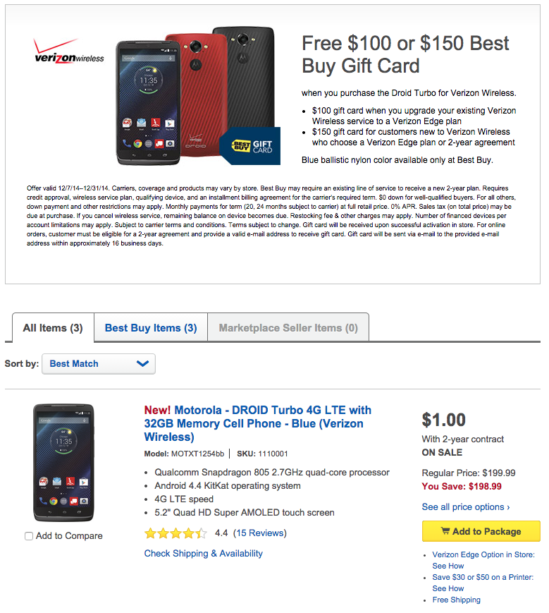 The DROID Turbo, which is easily one of the better phones of 2014, has been slashed to just $1 at Best Buy with a new 2-year contract. To sweeten the deal, Best Buy will also toss in a $150 gift card if you are a new Verizon customer and buy this phone. Minus the whole locking-yourself-in-for-2-years part of the deal, they are, in a way, paying you to buy the DROID Turbo. Not bad, right?